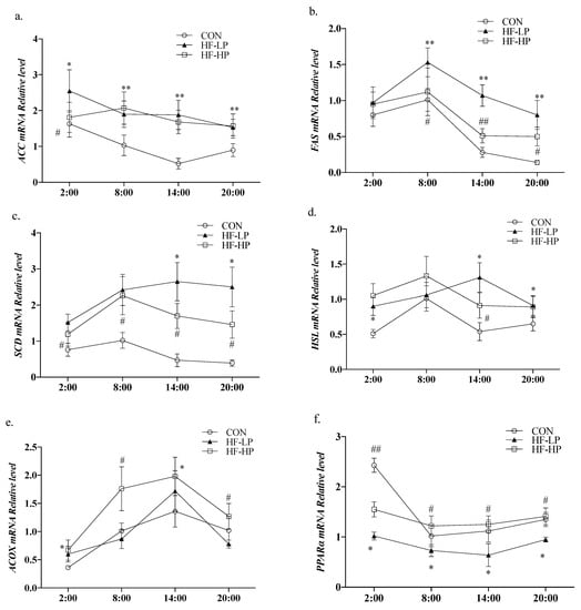 In Figure 4a,b, acetyl coenzyme A carboxylase α (ACC) and fatty acid synthase (FAS) expression levels in the CON group were elevated during the active phase and decreased during the resting phase, showing significant diurnal differences. The HF-LP diet significantly increased the expression of ACC, FAS, and sterol regulatory element binding protein 1C (SREBP-1C). As shown in Figure 4d–f, hormone-sensitive lipase (HSL) and acyl coenzyme A oxidase (ACOX) expression in the HF-LP group increased slowly, indicating that high-fat feeding was unable to metabolize the remaining fat in a timely manner; in contrast, ACOX and peroxisome proliferator-activated receptor α (PPAR-α) expression was significantly elevated after HF-HP diet intervention (p < 0.01), in line with the trend observed in the CON group.