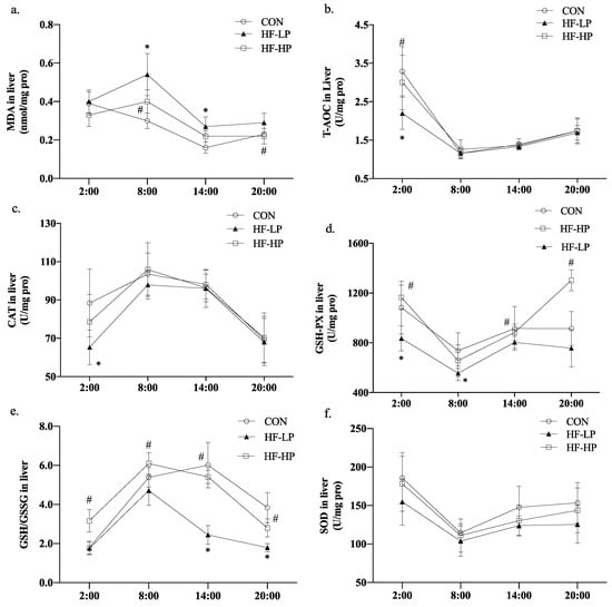 We investigated whether weight loss due to a high-protein diet affected the redox status of the body. Figure 5a shows that MDA levels in the HF-LP group increased from 2:00 to 8:00, indicating a disrupted circadian rhythm. A high-protein intervention reduced MDA levels. As shown in Figure 5b–d, T-AOC, CAT, and GSH-PX declined in the HF-LP group compared with the CON group but increased in the HF-HP group, and the GSH-PX levels in the HP group returned to the same level as those in the CON group. In Figure 5e, the GSH/GSSG levels in the HF-HP group were evidently higher than those in the HF-LP group at each time point; Figure 5f shows that the SOD levels in the HF group had no significant change than those in the CON group. A high-fat diet disrupted the circadian rhythm of the redox state, and the antioxidant levels were lower than those in the CON group at all time points. The high-protein intervention restored them to near-normal or even better levels than those in the CON group.