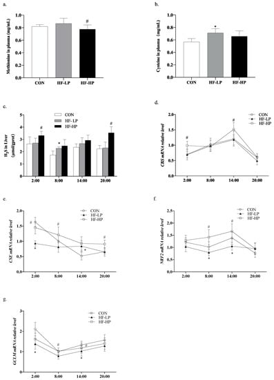 Effects of a high-protein diet on the circadian rhythms of hepatic H2S levels and the transsulfuration pathway-related genes. (a) Cysteine levels in plasma. (b) Methionine levels in plasma. (c) Circadian rhythm variation in hepatic H2S levels. (d) Circadian rhythm variation in hepatic CBS relative levels. (e) Circadian rhythm variation in hepatic CSE relative levels. (f) Circadian rhythm variation in hepatic NRF2 relative levels. (g) Circadian rhythm variation in hepatic GCL relative levels. Data are expressed as the mean ± SD (n = 10 rats per group); * p < 0.05, HF-LP group compared with the CON group; # p < 0.05, HF-LP group compared with the HF-HP group. SD, standard deviation; CON, control; HF-LP, high-fat/low-protein; HF-HP, high-fat/high-protein; CBS, cystathionine-beta-synthase; CSE, cystathionine-γ-lyase; NRF2, nuclear factor erythroid 2-related factor 2; GCLM, recombinant glutamate-cysteine ligase modifier subunit.