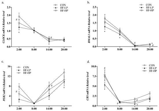 Effects of a high-protein diet on the circadian rhythm changes of liver CLOCK genes. (a) Circadian rhythm variation in hepatic CLOCK relative levels. (b) Circadian rhythm variation in hepatic BMAL1 relative levels. (c) Circadian rhythm variation in hepatic PER2 relative levels. (d) Circadian rhythm variation in hepatic CRY relative levels. Data are expressed as the mean ± SD (n = 10 rats per group); * p < 0.05, HF-LP group compared with the CON group; # p < 0.05, HF-LP group compared with the HF-HP group. SD, standard deviation; CON, control; HF-LP, high-fat/low-protein; HF-HP, high-fat/high-protein; CLOCK, circadian locomotor output cycle kaput; BMAL1, brain and muscle Arnt-like protein 1; PER2, period 2; CRY, cryptochrome.