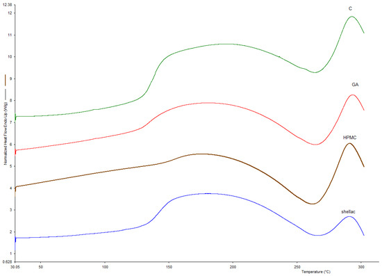 DSC graph of probiotic preparations with different coatings. C—dried, uncoated sample; GA—sample coated with gum arabic; HPMC—sample coated with hydroxypropyl methylcellulose; shellac—sample coated with shellac.