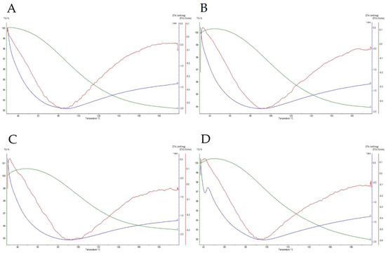TG/DTA for (A) control (dried, uncoated); (B) samples coated with gum arabic; (C) samples coated with hydroxypropyl-methylcellulose; (D) samples coated with shellac.