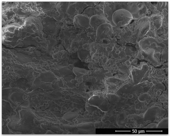 The glass transition temperature was analyzed using both DSC and TG/DTA. This parameter is a property of amorphous materials that are formed, e.g., by removing the dispersing medium. This phenomenon occurs in the process of fluidized bed drying, where water (the dispersing medium) is removed and the duration of the process is insufficient for crystallization to occur; therefore, the dried material stays in an amorphous state. Above a critical temperature, described as the glass transition temperature, the dried material will start to change its structure from a glassy solid state to a rubbery form. This structural change can impact the physiochemical properties of a product and impact the viability of dried probiotics. Differential scanning calorimetry is a method that is well suited for measuring such changes in biological systems. It works by heating the sample with reference to an inert material (i.e., a material that is not undergoing a phase transition in a selected temperature range). Phase transitions such as glass transition are then registered as a difference in heat as a function of temperature between the sample and the reference material. The glass transition temperatures were measured for three dried samples coated with different coating materials (gum Arabic, hydroxypropyl methylcellulose, and shellac), as well as for dried, uncoated samples (Figure 1). All temperatures were high enough to provide stability and long shelf-life, and they are compared with the temperatures obtained using TG/DTA in Table 1. TG/DTA analysis was used to compare the Tg values. Figure 2 shows the recorded thermal properties of the samples, where it can be seen that the glass transition was recorded in a similar range as when using DSC. Samples after coating were also visualized using SEM (Figure 3) to show the surface of the pellets after using different coating materials. Additionally, bacterial cells immobilized on the surface of a single microcellulose pellet were observed (Figure 4).