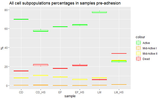 Percentages of cell subpopulations in samples post adhesion. CD—C. divergens; CD_HS—C. divergens after heat shock; EF—E. faecium; EF_HS—E. faecium after heat shock; LM—L.mesenteroides; LM_HS—L. mesenteroides after heat shock.