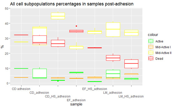 To measure the distribution of subpopulations in the post-adhesion samples, the supernatant left after incubation and washing of the cells was analyzed. This was necessary since the samples after trypsinization contained a combination of bacterial and epithelial cells, and as such were not suitable for flow cytometry. They were still enumerated using the pour plate method. The post-adhesion samples showed very low numbers of active cells. This led to the conclusion that the active subpopulation was adhering to the Caco-2 cells during incubation. The composition of the samples (Figure 6), which exhibited higher contents of dead, mid-active I, and mid-active II cells than pre adhesion, showed that these subpopulations were unable to adhere, and were left suspended in the medium, which was analyzed for its contents. Caco-2 cells are a well-differentiated adherent cell line that is used for testing the adhesion of intestinal bacteria, studies of transmembrane transport, and studies of bacterial pathogen invasion. The results clearly show that the damage sustained by bacterial cells influences their ability to adhere to Caco-2 cells. All three groups—mid-active I and II and dead cells—showed low levels of adhesion compared to active cells. Cellular damage may alter the surface properties of probiotic cells, such as through changes in the expression or accessibility of adhesion-related molecules. For example, damage-induced modifications in the expression of lectins or surface proteins on probiotic cells may impact their ability to recognize and adhere to specific receptors on Caco-2 cells [11,13].