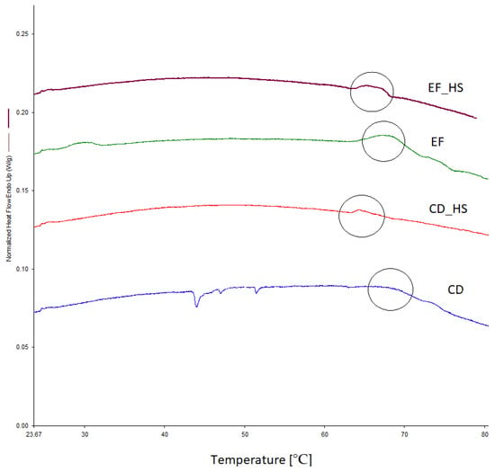Thermal stress is a primary factor, occurring during drying, influencing cell viability and probiotic properties. DSC is sensitive to protein denaturation and can be used to determine the thermal resistance of cells. Lepock [32] reported that the onset temperature of protein denaturation is correlated with growth inhibition and the onset of cell lethality. It is, however, highly strain specific, and dependent on growth conditions. For example, the onset of denaturation for Bacillus psychrophilus was measured at only 30 °C, while it reached 55 °C and 65 °C for Bacillus stearothermophilus WAT and Bacillus stearothermophilus ATCC12016, respectively. Figure 8 summarizes the DSC measurements of thermal stability for E.facium and C. divergens grown under optimal conditions and after heat shock. The start of the denaturation process can be observed between 65 °C and 70 °C. The exact temperatures were 68.05 °C and 66.94 °C for E. faecium with and without heat shock, respectively, and 68.02 °C and 64.39 °C for C. divergens.