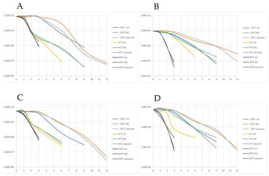 (A) E. faecium viability after storage under different conditions (−20 °C, 4 °C, 20° and packaging atmosphere with air, N2, and vacuum) for dried samples; (B) E. faecium viability after storage under different conditions (−20 °C, 4 °C, 20° and packaging atmosphere with air, N2, and vacuum) for coated samples; (C) L. mesenteroides viability after storage under different conditions (−20 °C, 4 °C, 20° and packaging atmosphere with air, N2, and vacuum) for dried samples; (D) E. faecium viability after storage under different conditions (−20 °C, 4 °C, 20° and packaging atmosphere with air, N2, and vacuum) for coated samples.