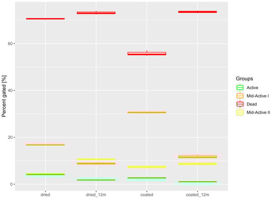 The dried preparations were stored for 12 months in different atmospheres and at different temperatures. Samples were measured after 1, 2, 3, 6, 9 and 12 months of storage or until the point at which their viability decreased below the 106 cfu/g threshold. The results (shown in Figure 9) show that the viability of stored preparations (measured in cfu/g) was highest for the samples stored at −20 °C, as those were the only samples to have a recorded viability of over 106 cfu/g for the whole 12 months. Samples stored at 4 °C also showed an acceptable shelf-life of 6–9 months. Samples stored at 20 °C lost their viability the fastest (after only 3 months). Modified atmospheres (N2 and vacuum) also improved the shelf-life of samples compared to those kept in contact with air. For uncoated samples in particular, both variants had a prolonged shelf-life of 9 months compared with the 6 months for samples in contact with air. The beneficial effect of a modified atmosphere can be attributed to limiting the oxidation processes, effectively achieving the same level of stability as obtained by coating. The subpopulations in the samples were also determined using IFC, both fresh after drying and after 12 months. Most notable was the reduction in the number of active cells and the increase in both dead and mid-active subpopulations (Figure 10).