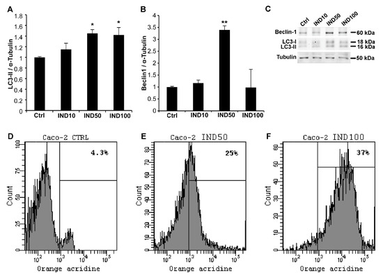To evaluate the potential effect of IND in inducing autophagy, the expression levels of two autophagic markers, LC3-II and Beclin1, were evaluated by Western blot analysis. The results indicate that the expression of the LC3-II protein increased in a dose-dependent manner in the IND-treated Caco-2 cells compared with the untreated control (Figure 1A). Exposure to IND50 induced the up-regulation of Beclin1 by about 3.5-fold (Figure 1B).