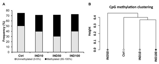 Reduced representation bisulphite sequencing (RRBS) results. (A) Staked column chart of % CpG methylation. Only the fully methylated (95–100%) or unmethylated (0–5%) fractions are represented. (B) Hierarchical clustering graph of global genomic methylation assessed in Caco-2 cells either untreated or treated with different concentrations of IND. Distance method: correlation; clustering method: ward. See also Figures S2 and S3.