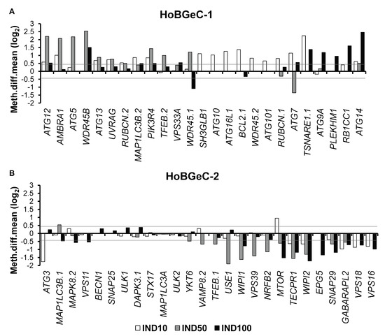 IND effects on promoter methylation of autophagy genes: DMC analysis. Representative bar plots of HoBGeC-1 (A) and HoBGeC-2 (B) weighted average values. The lines indicate a robust methylation difference with respect to the controls (corresponding to a |diff.meth| > 25%).