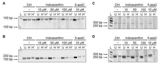 For the 472 site (Figure 4D), the decrease in the band intensity from the undigested samples to the digested ones was weaker in cells treated with IND than that in untreated cells. Collectively, the obtained results suggest that IND can methylate the 472 site and demethylate the other analysed sites, showing a stronger effect on the 255 and 299 sites. As expected, 5-azaC caused the demethylation of the observed sites, as demonstrated by the strong weakening of the band intensity from the undigested to the digested samples.