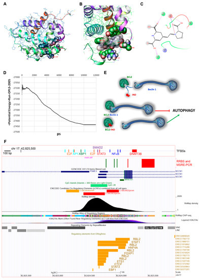 IND affects Beclin1−Bcl-2 interaction and BECN1 regulation. (A) Three-dimensional representation of binding of Beclin1 to Bcl-2 active site (PDB id 5VAU). (B) Three-dimensional representation and (C) amino acids map of the IND − Bcl-2 binding mode after 10 ns of molecular dynamic simulation. (D) Potential energy in the molecular dynamic simulation for the IND–Bcl-2 complex. (E) Hypothetical interference mechanism of IND in Beclin1−Bcl-2 interaction. Protein drawings are based on Bcl-2 (PDB ID 5VAU) and Beclin1 (Alphafold ID AF-Q14457-F1) structures. (F) UCSC Genome Browser view of the BECN1 promoter (hg38 assembly). The Browser view includes a custom track, which shows RRBS and MSRE-PCR results. Top: known transcription factors and DNMT3B binding sites.