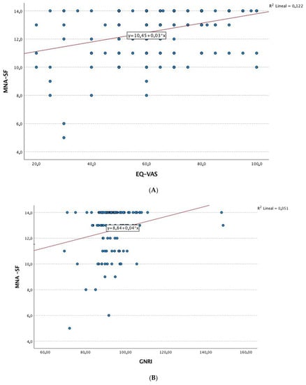 Similarly, Table 5 shows an alternative multivariate analysis based on linear regression, with the MNA as the dependent variable (0 to 14 points, with 0 representing the worst nutritional status and 14 representing the best). In this model, the MNA score remained associated with age (β = −0.294); inflammatory disease activity was evaluated using the DAS28-ESR (β = −0.236); and quality of life was evaluated using the EQ-VAS (β = 0.229) and the GNRI value (β = 0.251) (Figure 3).