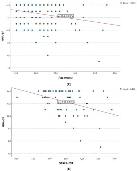 Furthermore, several studies have shown a relationship between inflammatory disease activity, cachexia, and sarcopenic obesity in RA. High levels of inflammatory cytokines, such as tumor necrosis factor α (TNF-α), interleukin (IL) 1β, IL-6, and CRP, together with loss of muscle mass, could account for malnutrition in affected patients [,]. We found an association between impaired nutritional status according to the MNA and all the measures of inflammatory disease activity, especially DAS28-ESR and elevated CRP levels.