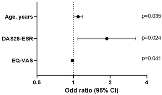 Table 4 shows the results of the multivariate logistic regression analysis for the dependent variable impaired nutritional status according to the MNA score in patients with RA. Age and inflammatory disease activity (DAS28-ESR) were independently associated with impaired nutritional status, whereas better physical function (EQ-VAS) was a protective factor.