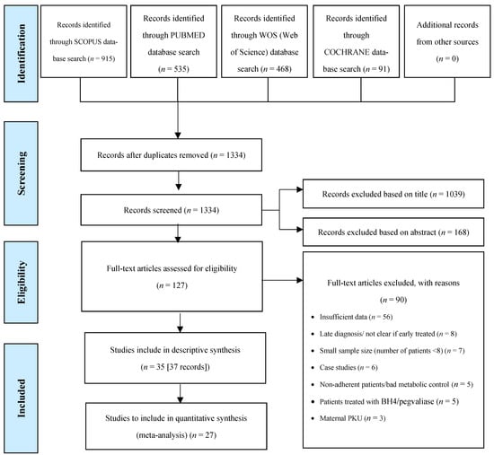 The PICO (population, intervention, comparison, and outcomes) method was applied to formulate the review question and to determine the eligibility criteria. All retrospective and prospective longitudinal studies, randomised controlled trials, observational studies (case–control, cohort, and cross-sectional), letters, systematic reviews, conference abstracts, and PhD reports conducted in patients with PKU who were aged < 50 years, identified via newborn screening and then diagnosed via a confirmatory blood Phe concentration > 360 µmol/L, and continuously treated with a Phe-restricted diet starting within the first month of life were included.