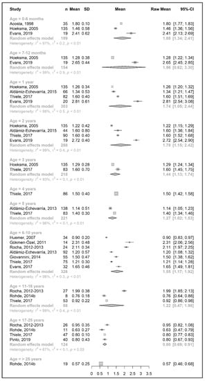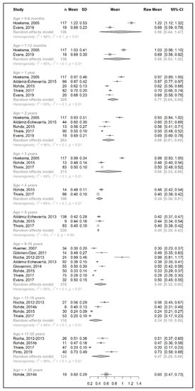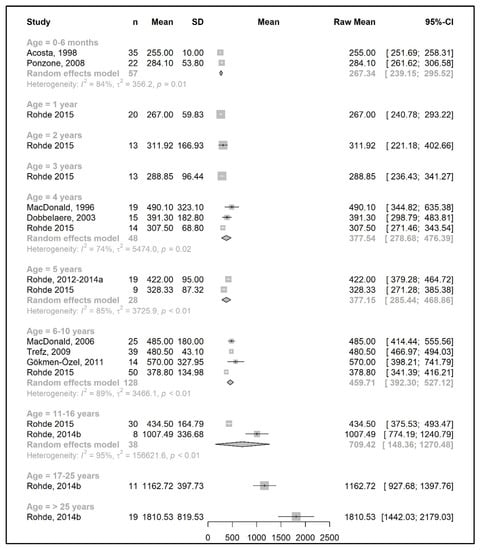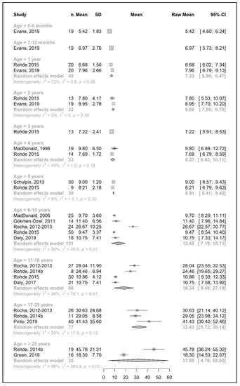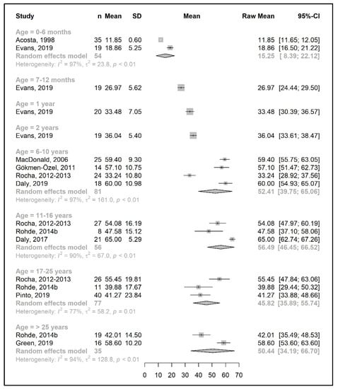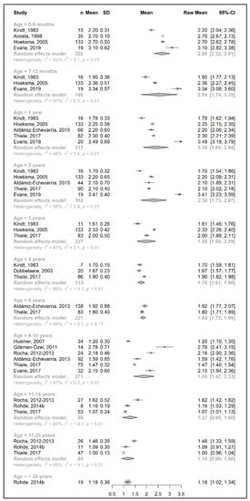 The meta-analysis results are presented as raw means with confidence intervals (CIs) for each age group and are illustrated in the forest plots (Figure 2, Figure 3, Figure 4, Figure 5, Figure 6, Figure 7, Figure 8 and Figure 9). A meta-analysis could only be performed for age groups if there were at least two studies per age group. When there was only one study available, the mean actual intake from that study only is shown in the forest plot.