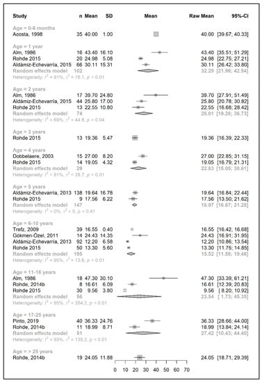 Figure 2 and Figure 4 show results from the actual amounts of Phe and natural protein consumed each day. The mean intakes of Phe (mg/day) and natural protein (g/day) increased from birth until 6 years of age (267 mg Phe/day and 5.4 g natural protein/day at 6 months of age; 377 mg Phe/day and 8.9 g natural protein/day at 5 years of age) but decreased when expressed as g/kg/day, with 0.96 at 0–6 months of age and 0.40 at 5 y of age. However, the increase in natural protein/Phe tolerance per day (mg of Phe or g of protein) was more apparent at the beginning of late childhood (6–10 years), which was approximately 1.5-fold that of early childhood (2–5 years), with seven studies allowing for higher blood Phe target levels [27,42,44,45,48,51,54,57]. During the pubertal growth spurt, the mean Phe/natural protein tolerance was approximately three times higher than the Phe/natural protein tolerance in the first year of life, reaching a mean Phe intake of 709 mg/day and a natural protein intake of 18 g/day. Post adolescence, a pooled analysis could only be performed for natural protein intake. The mean natural protein tolerance reached its peak (32.4 g/day) at the age of 17 years and remained consistent (31.6 g/day) in adulthood, but limited data were available (n = 4 studies, 112 patients).