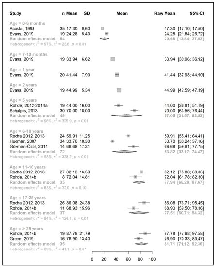 To answer the research question: “does natural protein/Phe intake change over the life span?”, a meta-analysis was performed synthesising the available longitudinal data on protein and Phe intakes, if a minimum of 2 studies were available. For effect size measure, we used the “mean change per year”. The heterogeneity between studies was estimated using the I2 statistic, with values of 25%, 50%, and 75% considered to indicate low, medium, and high levels of heterogeneity, respectively. A random-effects model was used to calculate pooled estimates using the R software “meta (version 6.5-0)” package (R foundation for statistical computer, Vienna, Austria) [24]. A p value less than 0.05 was considered statistically significant.