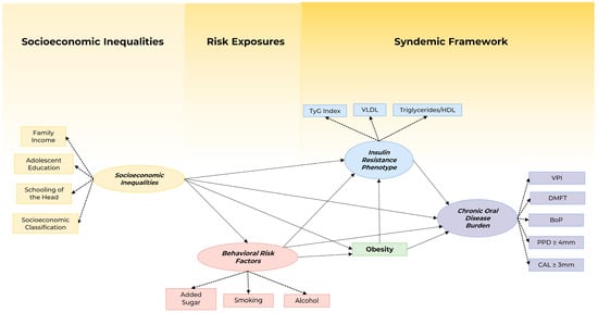 We constructed a theoretical model to investigate a syndemic framework involving socioeconomic inequalities, behavioral risk factors for NCDs, and the grouping of obesity and early signs of diabetes risk with the co-occurrence of caries and periodontitis in adolescents. Socioeconomic Inequalities were the ancestral variable influencing the Behavioral Risk Factors resulting in the NCDs outcomes, namely: obesity, Insulin Resistance Phenotype with Chronic Oral Disease Burden. The model was adjusted for sex (Figure 1).