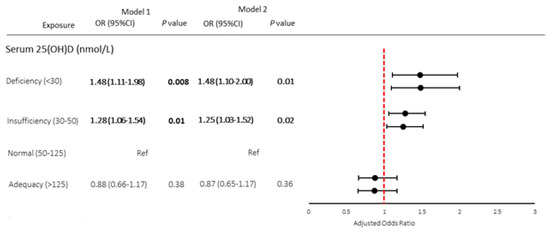 The associations between 25(OH)D and CVD are summarized in Figure 2. Both the results from Model 1 and Model 2 were plotted side by side displaying various serum 25(OH)D levels: deficiency, insufficiency, normal, and adequacy. After controlling for age, gender, and race/ethnicity, participants with serum 25(OH)D deficiency had significantly higher odds of having CVD compared to those with normal 25(OH)D level (AOR = 1.48; 95% CI = 1.11–1.98; p < 0.05). Those with insufficient serum 25(OH)D were also more likely to have CVD than those with normal 25(OH)D levels (AOR = 1.28; 95% CI = 1.06–1.54; p < 0.05). After the adjustment of age, gender, race/ethnicity, BMI, hypertension, hypercholesterolemia, diabetes, and CRP level, 25(OH)D deficiency (AOR = 1.48; 95% CI = 1.10–2.00; p < 0.05) and 25(OH)D insufficiency (AOR = 1.25; 95% CI = 1.03–1.52; p < 0.05) remained as the independent risk factors for CVD. The risk for CVD disappeared in all models for those with 25(OH)D adequacy.