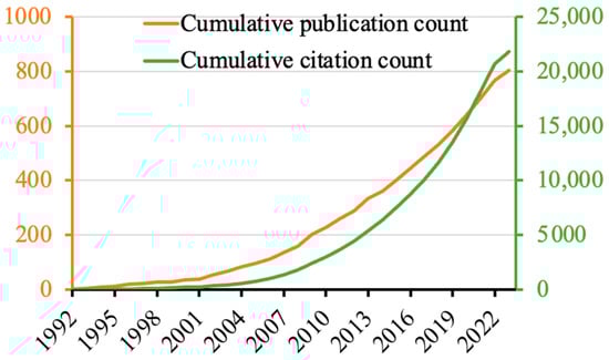 The cumulative publication and citation counts of the FCDBs research are shown in Figure 1. The 803 papers were cited 21,813 times in total, with an h-index of 76 and a CPP of 27.2). The first paper indexed in WoSCC was published in 1992 by Pennington [] and described the usefulness of FCDB for researchers to identify core foods for their own studies. In that paper, the FCDB described was the USDA 1987–88 NFCS (the United States Department of Agriculture 1987–88 Nationwide Food Consumption Survey). Since this paper was published, the publication and citation counts have gradually increased over the years. The ratio of original articles (n = 677, CPP = 28.4) to reviews (n = 56, CPP = 42.2) was 12:1. The top 5 most productive authors, institutions, countries, journals, and journal categories are listed in Table 2. The most productive author was Dr. Paul M. Finglas, the Head of the Food Databanks National Capability at the Quadram Institute (Norwich, UK) and the Managing Director of EuroFIR. His most cited paper among this dataset was about the development of an online Irish food composition database together with EuroFIR []. Interestingly, the most productive institutions were the USDA and the World Health Organization (WHO) instead of universities. Meanwhile, the most productive countries were led by the United States, followed by European countries and Australia. The top five most productive journals consisted of some traditional journals, such as the Journal of Food Composition and Analysis (started in 1987; 2022 impact factor = 4.3; Q2 in JCR Food Science and Technology and Chemistry, Applied), as well as newer journals, such as Nutrients (started in 2009; 2022 impact factor = 5.9; Q1 in JCR Nutrition and Dietetics).