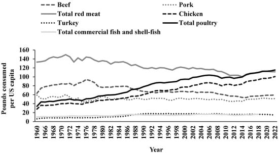 Chicken meat is the most consumed meat in the US per capita []. The US has the largest broiler chicken industry in the world and more chicken is consumed in the US than in any other country. In 2022, annual consumption of chicken and turkey in the US per capita was estimated to be 100.6 pounds (lb) and 14.7 lb, respectively, for a total of 115.3 lb of poultry. In comparison, annual consumption of beef and pork was 59.4 lb and 51.4 lb per capita, respectively, for a total of 111.3 lb of red meat. Total consumption of commercial fish and shellfish was 16.1 lb per capita (last reported in 2018) []. From 1960 to 2022, chicken and total poultry consumption steadily increased and more than tripled. In contrast, pork consumption remained stable and beef and total red meat intakes have decreased (Figure 1).