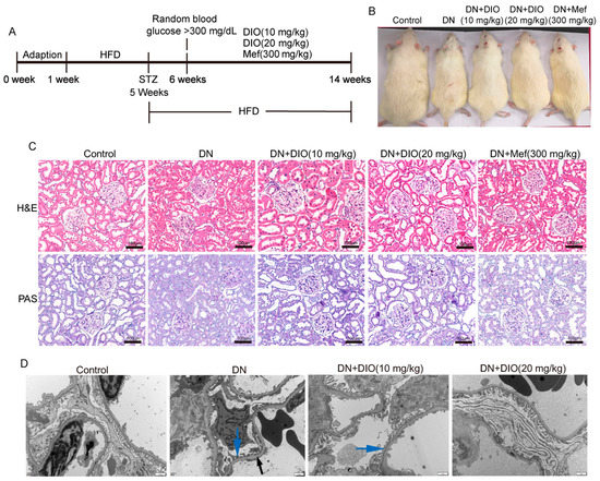 Male Sprague Dawley rats, 7–8 weeks old, were purchased from Dossy Experimental Animals Co., Ltd. (Chengdu, China). All rats were maintained in controlled conditions with constant 22–25 °C, 60–70% humidity, and a 12 h light/dark cycle. After acclimatization for 1 week, the rats were placed into two groups: the control group (n = 8) and the diabetic group (n = 32). The establishment of diabetic rats refers to our previous article [22]. The rats were administrated with a high-fat diet (HFD) for 4 weeks and then intraperitoneally injected with STZ (35 mg/kg). One week later, rats with random blood glucose >300 mg/dL were separated into 4 groups: DN group (n = 8), DN + DIO (10 mg/kg, n = 8) group, DN + DIO (20 mg/kg, n = 8) group, and DN + Mef (300 mg/kg, n = 8) group (a positive control). DIO and Mef were administered by gavage for 8 weeks, daily. All animal procedures were approved by the Animal Ethics Committee of Northwest A&F University, and Chengdu Dossy Experimental Animals Co., Ltd. (N20071065).