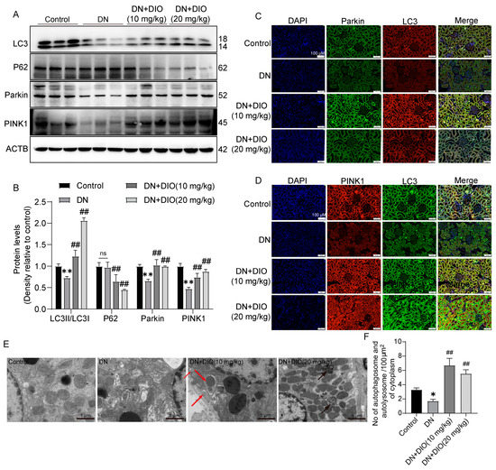 Increasing evidence has indicated that autophagy and mitophagy are inhibited under DN conditions. In the present study, the downregulation of LC3II/LC3I was restored by DIO. In addition, DIO decreased P62 expression significantly (Figure 2A,B). Mitophagy is one of the forms of autophagy, which is regulated by Parkin and PINK1. DIO also relieved the downregulation of mitophagy-mediated proteins (Parkin and PINK1) in DN rats (Figure 2A,B and Figure S1B,C). Furthermore, the colocalization of PINK1 with LC3 and Parkin with LC3 was enhanced by DIO (Figure 2C,D). Moreover, autophagosome-vesicle-coated mitochondria or other cellular components (red arrow) and autolysosome structures remaining after autophagosome degradation by lysosomes (black arrows) were also observed in DIO-treated DN rats (Figure 2E). These data suggest that autophagy, autophagy flux, and mitophagy were enhanced by DIO in DN rat kidneys.