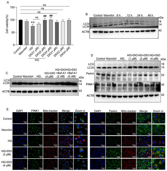 DIO induced autophagy and mitophagy in HK-2 cells exposed to HG. (A) Cell viability of DIO-treated HK-2 cells with or without HG (30 mM) for 24 h. (B) The representative images of LC3 and ACTB immunoblotting of HG (30 mM) treatment for 6, 12, 24, and 48 h. (C) The representative images of LC3 and ACTB immunoblotting of HG+DIO+Baf-A1 treatment. (D) The representative images of LC3, Parkin, PINK1, and ACTB immunoblotting of HG+DIO treatment. (E) The mitochondrial localization of PINK1 and Parkin, scale bars = 50 µm. Data are expressed as mean ± SD, n = 6 for each experiment. ** p < 0.01, significantly different compared to the control group; ## p < 0.01, significantly different compared to the HG group; ns, no significance.