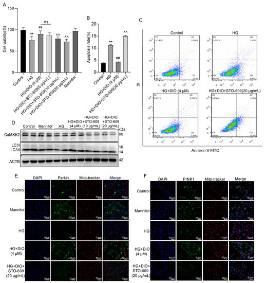 Inhibition of CaMKK2 abolished autophagy and mitophagy induced by DIO in HK-2 cells. (A) Cell viability. (B) Quantification of apoptosis ratio. (C) Cell apoptosis detected by flow cytometry. (D) The representative images of CaMKK2, LC3, and ACTB immunoblotting. (E,F) Mitochondrial localization of PINK1 and Parkin. Data are expressed as mean ± SD, n = 6 for each experiment. ** p < 0.01, significantly different compared to the control group; ## p < 0.01, significantly different compared to the HG group; ^^ p < 0.01, significantly different compared to the HG+DIO group; ns, no significance.