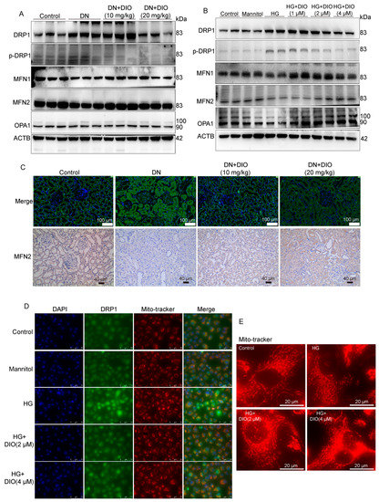 Mitochondrial dynamics (fission and fusion) and mitophagy belong to mitochondrial quality control and are two closely related processes. In Figure 8A and Figure S4C, the increase in mitochondrial fission proteins DRP1 and p-DRP1 in DN rats was reversed by DIO treatment. The immunofluorescence results also showed that DIO downregulated DRP1 expression noticeably (Figure 8C and Figure S4B). MFN1/2 and OPA1 are proteins regulating the fusion of mitochondrial membranes. As shown in Figure 8A,C and Figure S4C, DIO upregulated MFN1/2 expression but had no significant effect on OPA1 expression. Similar results were obtained in HK-2 cells. DIO downregulated DRP1/p-DRP1 expression and restored MFN1/2 expression (Figure 8B and Figure S4A). In addition, there was a decrease in OPA1 expression in HG-treated cells, and DIO restored it (Figure 8B and Figure S4A). Additionally, the increased mitochondrial localization of DRP1 was inhibited by DIO (Figure 8D). Moreover, mitochondrial fragmentation was observed in HG-treated HK-2 cells, and DIO improved it (Figure 8E). These results confirmed that DIO relieved mitochondrial dynamics disorder.