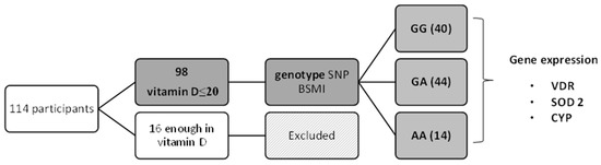 The study was conducted with adults (18–59 years of age) in Rio Grande do Sul State (southern Brazil) from August to November (i.e., winter and spring). The volunteers signed an informed consent form and answered a questionnaire with their socioeconomic data and lifestyle. After fasting for 12 h, venous blood was collected for analysis. After obtaining the serum vitamin D values results, volunteers with measurements of up to 20 ng/mL continued in the study [17], and the others were excluded (Figure 1). Genotyping for BsmI SNP was performed, and afterwards, participants were divided into three groups according to genotypes: group GG (n = 40), group GA (n = 44), and group AA (n = 14).