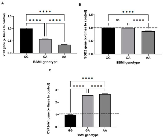 In order to clarify whether the BsmI SNP influences the expression of other genes related to the physiological role of vitamin D, VDR, CYP24A1, and SOD-2 gene expression was studied in the groups of the three genotypes. Thus, we know that the VDR can modulate the expression of various genes, and its inactivation occurs due to the lack or excess of vitamin D since the almost ubiquitous expression of the VDR gene corroborates data from the last 30 years showing that vitamin D not only regulates calcium homeostasis but also promotes immunity, growth, and cell differentiation [27].