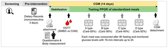 The key scheme of the study design is presented in Figure 1. Participants were instructed to record nonconsecutive 3 days of dietary records in the pre-intervention week. At the first visit, participants underwent baseline examination, which included general questionnaires and body measurements, and were connected to continuous glucose monitoring (CGM). At least 2 days after the first visit, participants performed an oral glucose tolerance test (OGTT) of glucose 75 g and compared blood glucose level CGM to self-monitoring blood glucose (SMBG) for validation. Blood samples for SMBG were taken by pricking the fingertip with a lancing device, and the blood glucose level was immediately measured using a glucose meter (CareSens N Premier, i-SENS Inc., Seoul, Korea). Afterward, participants were requested to visit in a fasting state after 8 h of fasting. Four meals were provided by staff according to the preference of the participants. The meals were prepared by the staff, and the food was weighed using an electronic scale (KB-2000, A&D Co., Seoul, Korea). Participants visited on a desired date and were asked to consume a meal within 30 min and stay 2 h after the meal to record blood glucose levels at 15 min intervals. When they completed the last meal, the participants were allowed to remove the CGM. All participants were informed about the study protocol and consented to participation by signing the consent form. They received a reward after their participation was completed. This study was approved by the Institutional Review Board of the Catholic University of Korea (No. 1040395-202203-07) and registered with the Clinical Research Information Service (CRIS) (KCT0007158), which is an online registration system for clinical trials and clinical research conducted in Korea and is affiliated with the WHO International Clinical Trials Registry Platform (ICTRP).