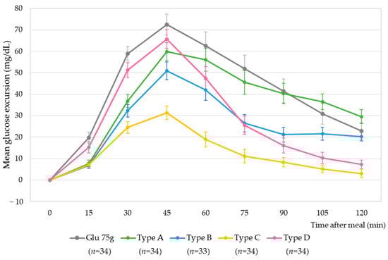 The individual postprandial glycemic response was measured in a fasting state after at least 8 h of fasting before meal and at 15 min intervals for 2 h after meal using CGM. The AUC (area under the curve) was calculated for all the areas under the blood glucose response curve down to a blood glucose concentration of 0 using the trapezoidal formula. The incremental AUC (iAUC) calculated the area under the blood glucose response curve down to fasting blood glucose [19]. Each individual was tested with four different meals as well as glucose 75 g on separate days, and the average fasting blood glucose was calculated as the mean of fasting blood glucose levels obtained on five different days. To check the clinical accuracy of blood glucose between CGM and SBGM, Clarke Error Grid Analysis was conducted. Based on a total of 34 paired CGM-SBGM measurements, the Clarke Error Grid Analysis showed 100% of glucose values falling into clinically acceptable error zones A and B (Figure S2).