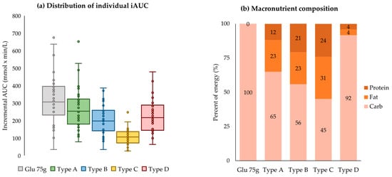 Figure 3 presents the distribution of the individual incremental AUC and macronutrient composition by each meal type. The box plot visualizes the distribution of individual postprandial glycemic responses (iAUC) for each meal type, allowing for easy comparison between the first and third quartiles. The box plot revealed that the range of iAUC was highest for glucose 75 g (249.8 to 393.5 mmol × min/L), followed by the rice-based meal (181.3 to 314.8), the sandwich (147.6 to 255.2), and the chicken salad (75.9 to 134.9). This order corresponds to the carbohydrate contents of each meal type, except the fruit bowl, with the rice-based meal having the highest carbohydrate intake as a percentage of energy at 65%, followed by 56% in the sandwich and 45% in the chicken salad. On the other hand, the range of iAUC in the fruit bowl (145.4 to 288.5) was slightly lower compared with that in the rice-based meal. The box plot also displays outliers beyond 1.5 times the interquartile range. Each meal type showed outliers at some time points, which indicates that some individuals respond very heavily to the same meal.