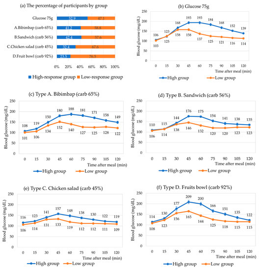 In order to classify individual PPGRs for each meal type, a data-driven cluster analysis was conducted using postprandial glucose levels measured at 10 different time points, including fasting blood glucose. Two distinct clusters emerged within each meal type based on the similarity of their postprandial glucose levels. These clusters were labeled as a “High-response” group, with relatively high PPGR, and a “Low-response” group, with relatively low PPGR, for ease of discussion.