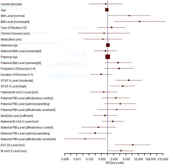 The forest plot that corresponds to the logistic regression model, linking the set of predictors with ON risk in Greek students of nutrition and dietetics, as assessed by the ORTO-15 questionnaire (N = 132). BMI = body mass index; STAIT-6 = State-Trait Anxiety Inventory; BI-AAQ-5 = Body Image-Acceptance and Action Questionnaire-5; PBI = Parental Bonding Instrument; MedDiet = Mediterranean diet; EAT-26 = Eating Attitudes Test-26.