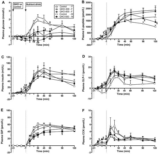 Response to the drink. There was no effect of treatment, but there was an effect of time (p = 0.01), on plasma CCK (Figure 2F). After each of the control, QHCl-300 and QHCl-600, CCK increased compared to baseline (all p < 0.05).