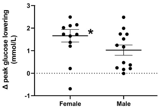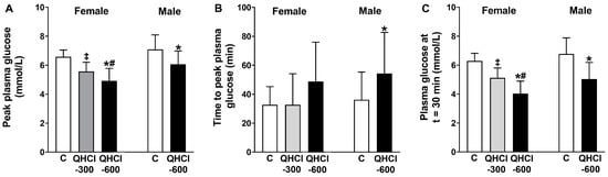 Response to the drink. The magnitude of the overall lowering of plasma glucose by QHCl-600 was greater in females than in males (p = 0.041) (Table 2). The magnitude of the lowering of peak glucose was greater in females than in males (p = 0.044) (Figure 4).