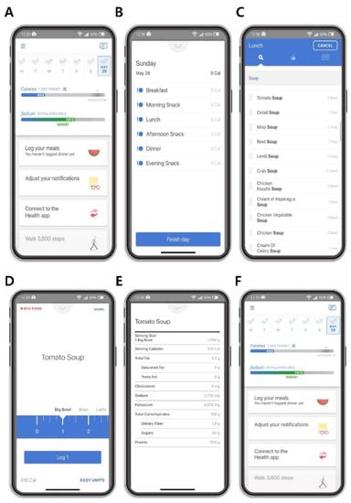 Once the participants logged their meals into the Noom application by selecting ‘Log’ (Figure 2D), they could view the number of calories and sodium consumed throughout the day and the number of remaining calories and sodium to meet the participant’s daily calories and sodium goal. The participant’s daily calorie target minimum was calculated based on a number of factors. Specifically, Noom used the basic principles of the Harris-Benedict equation to establish the participant’s minimal daily calorie intake [24]. Using this principle, the participant’s basal metabolic rate, which was based on the participant’s sex, age, height, and starting weight, was determined. The participant’s basal metabolic rate was then applied to the Harris-Benedict equation to determine the participant’s daily calorie target. Although Noom assumes a sedentary lifestyle for each participant, participants can increase that total calorie target allowance for that day by logging exercises throughout the day (not shown). The participant’s daily sodium target was determined according to the guidelines of the Dietary Approaches to Stop Hypertension (DASH) diet, which recommends a sodium intake of 2300 milligrams [25]. The participant’s daily calorie and sodium intake was calculated based on the types of meals logged in the smartphone application throughout the day (Figure 2F). Sodium intake during the first visit (baseline) and second visit (6 months after the first visit) was measured by averaging the daily sodium intake during the first and last weeks of application usage, respectively. Notably, the study duration (June 2018–February 2020) did not encompass the availability of the option in the latest version of the Noom Health application, allowing users to log meals by scanning barcode labels using smartphone cameras.