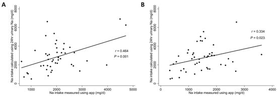 Figure 3. Correlation between dietary sodium intake measured by the smartphone application and that calculated using 24-h urine sodium at (A) baseline and (B) 6 months after enrollment.