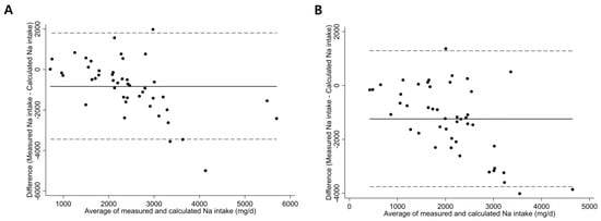 Figure 4. Bland-Altman plots showing mean difference and limits of agreement between dietary sodium intake measured by the smartphone application and that calculated using 24-h urine sodium at (A) baseline and (B) 6 months after enrollment. (A) Mean difference = −836.8, limits of agreement = −70.3, 1797.0, (B) Mean difference = −24.1, limits of agreement = −76.3, 4646.4.