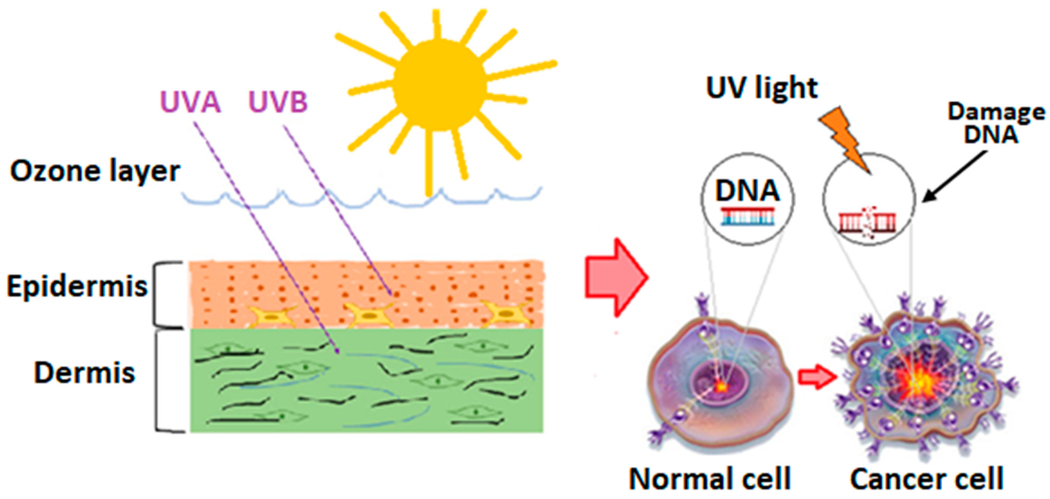 - D’Orazio, J.; Jarrett, S.; Amaro-Ortiz, A.; Scott, T. UV radiation and the skin. Int. J. Mol. Sci. 2013, 14, 12222–12248. [Google Scholar] [CrossRef]