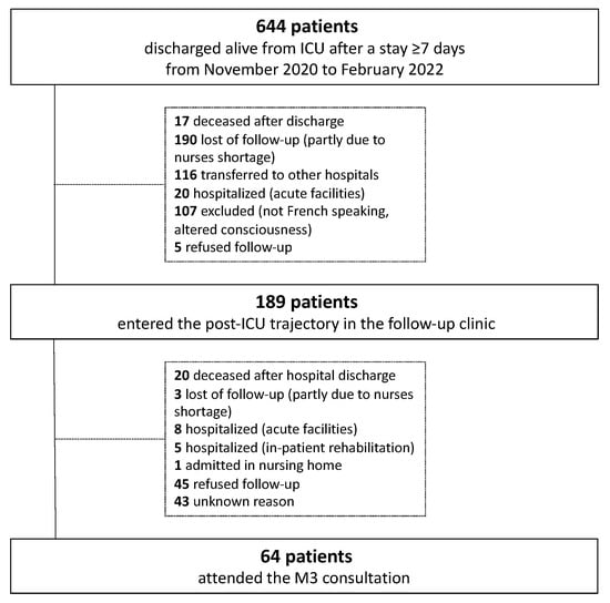 Between November 2020 and February 2022, 644 patients were discharged alive from the ICU after a stay of ≥7 days. Of these patients, 189 were assessed at T0. Finally, 64 attended the M3 consultations and were analyzed (Figure 2).