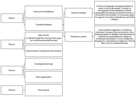 The research was carried out by seven trained researchers (authors and co-authors). After defining and presenting the contents and criteria that would indicate the presence or absence of these contents, the researchers randomly selected five apps for training. Therefore, each researcher, individually, performed the analysis of the apps and then presented their results to the group. Differences were widely discussed, with a consensus on how to use the developed protocol. All were responsible for determining the study protocol, keywords, and app search variables. The research team searched for apps related to diet and nutrition in the official Apple and Google Stores (websites and mobile devices) in Brazil. Li et al. [18] and Pagoto et al. [19] methodologies guided the group for keyword and variable definitions.