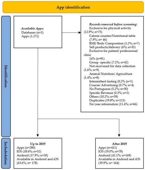 The keywords “nutrition” and “diet” in Portuguese were defined for the search strategy. Apps related to animal nutrition, magazines, private clinics with a first in-person appointment, professional use only (apps for dietitians, doctors, and nurses), sports use only, restaurant orders or sales, and those not directly related to food or water intake were excluded. Apps solely used to count calories and calculate body mass index (BMI) were also excluded. This content helps dietitians with their prescriptions but cannot promote changes in eating habits [21]. Calorie counting and BMI need correlation to help diet improve or change [22]. We excluded apps for the exclusive use of patients of a determined clinic (CLOSED APP), only used for physical activity (ONLY FOR PHYSICAL ACTIVITY), specific and limited for groups such as vegans, pregnant women, and nursing mothers (HEALTH SPECIFICS), and related to selling food (PRODUCTS SELLING).