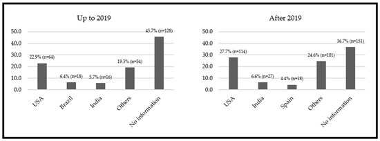 The total nutrition and diet-related selected apps in the official Google Play and App Store apps (on websites and mobile devices) before and after the COVID-19 pandemic began were 280 and 411, respectively (Figure 2). Figure 2 details the number of identified and maintained apps in the study and the reasons for exclusion. The data from the countries where the apps were developed is shown in Figure 3. According to the data, the United States of America (USA) was the primary developer in both periods. Data from the apps for the two stages are detailed in Tables S1 and S2 (Supplementary Material) and Figure 4.